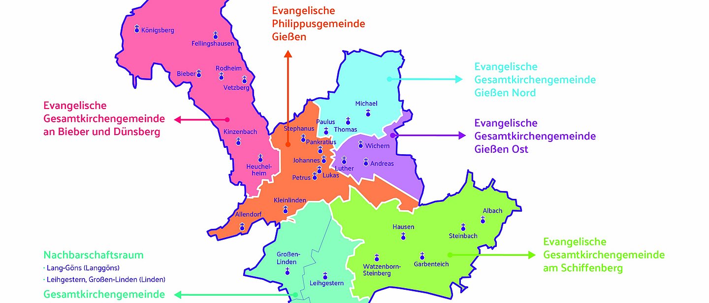 Zum Evangelischen Dekanat Gießen gehören 5 Gesamtkirchengemeinden (aus 26 Ortskirchengemeinden) und drei Kirchengemeinden in und um Gießen. Das Gebiet des Dekanats umfasst über die Stadt Gießen hinaus auch mehrere Gemeinden im Umland mit ihren zum Teil noch dörflichen Strukturen. Die Kirchengemeinden liegen nicht nur im Gebiet der Stadt Gießen, sondern auch in den Kommunen Biebertal, Fernwald, Heuchelheim, Langgöns, Linden und Pohlheim, die alle zum Landkreis Gießen gehören. Der Nachbarschaftsraum Lang-Göns und Linden wird sich bis Ende 2026 als Gesamtkirchengemeinde konstituiert haben.